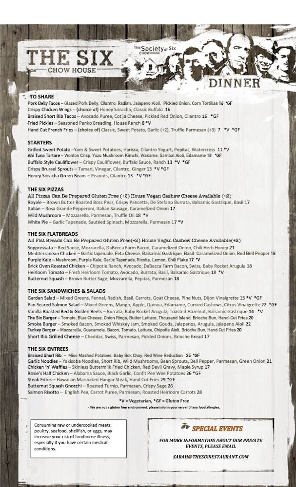 1200 The Mule absolut vodka ginger beer mint. The Six Pizzas The Six Pizzas Brunch Omelets Hash Brunch Waffles Toasts Brunch The Six Flatbread Brunch Burgers Sandwiches Brunch To Share Brunch Menu To Share Salads The Six Burgers Tacos Flatbreads The Six Entrees The Six Sides Desserts Brunch The Six Burgers Sandwiches Lunch. Vegetable Chow Mein or Chop Suey 625.